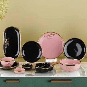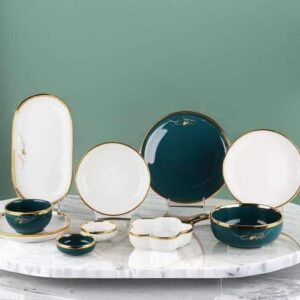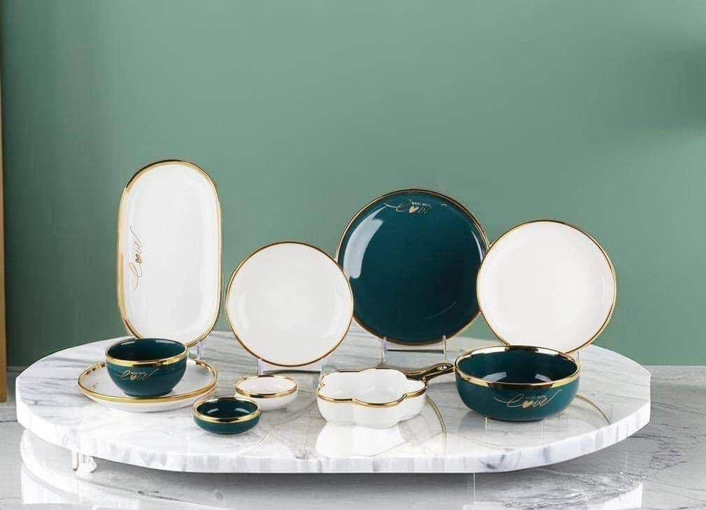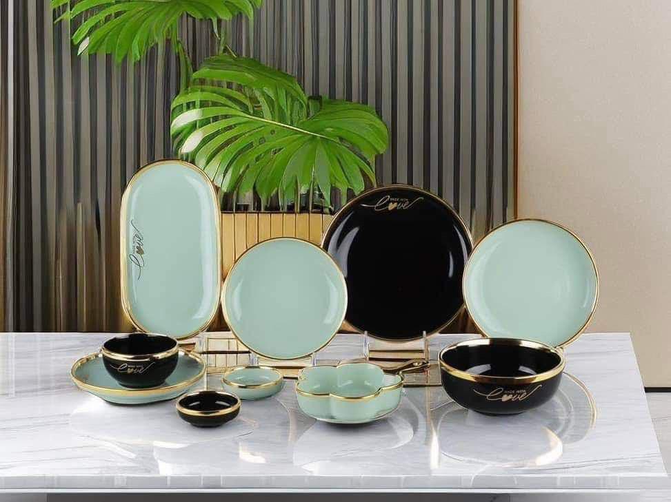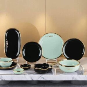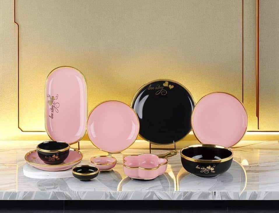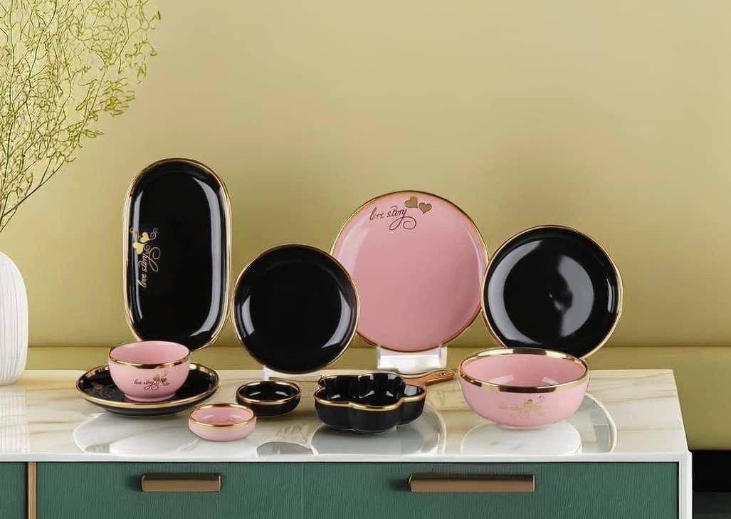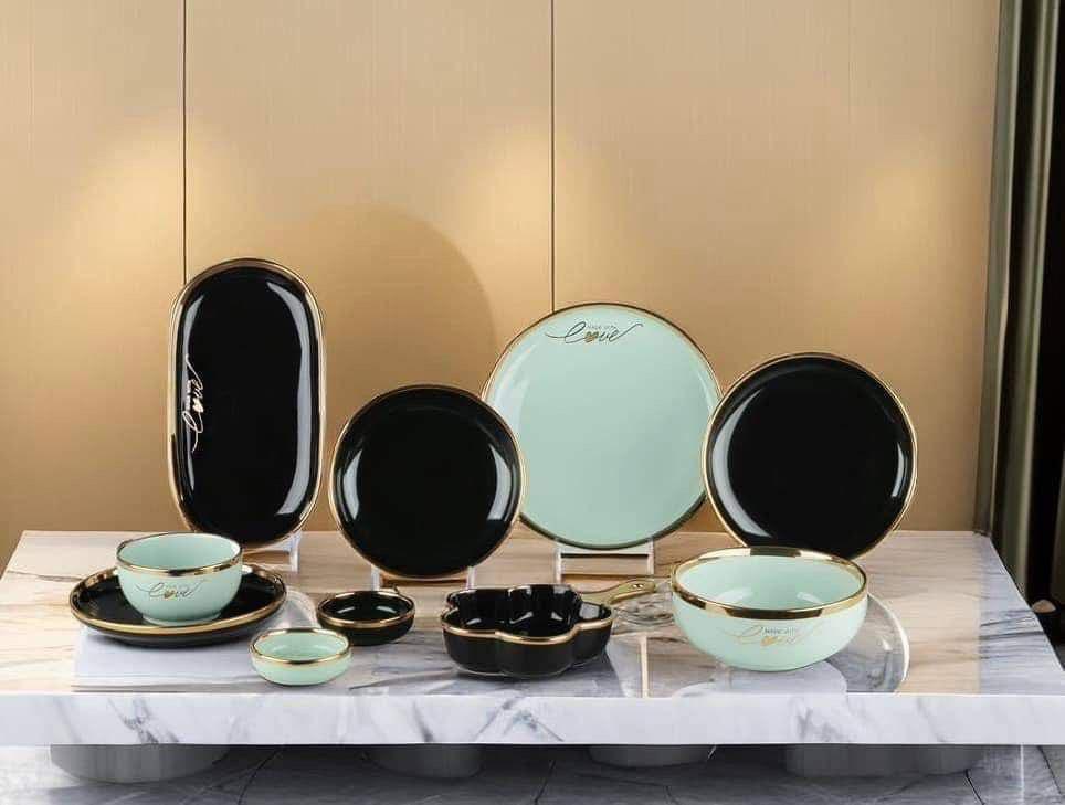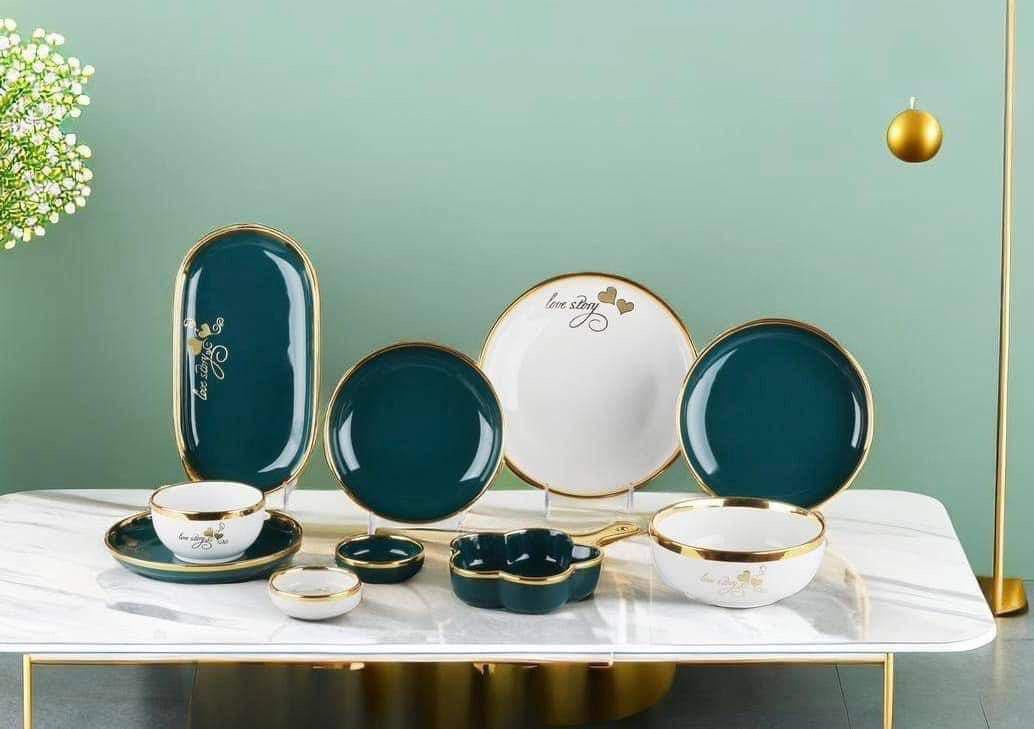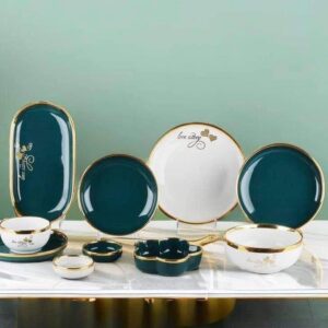 الطقم بالكامل مصنوع من خامات عاليه الجوده مطعم بالذهب المط صالح للأستخدام داخل الفرن والمايكروويف وغساله الاطباق